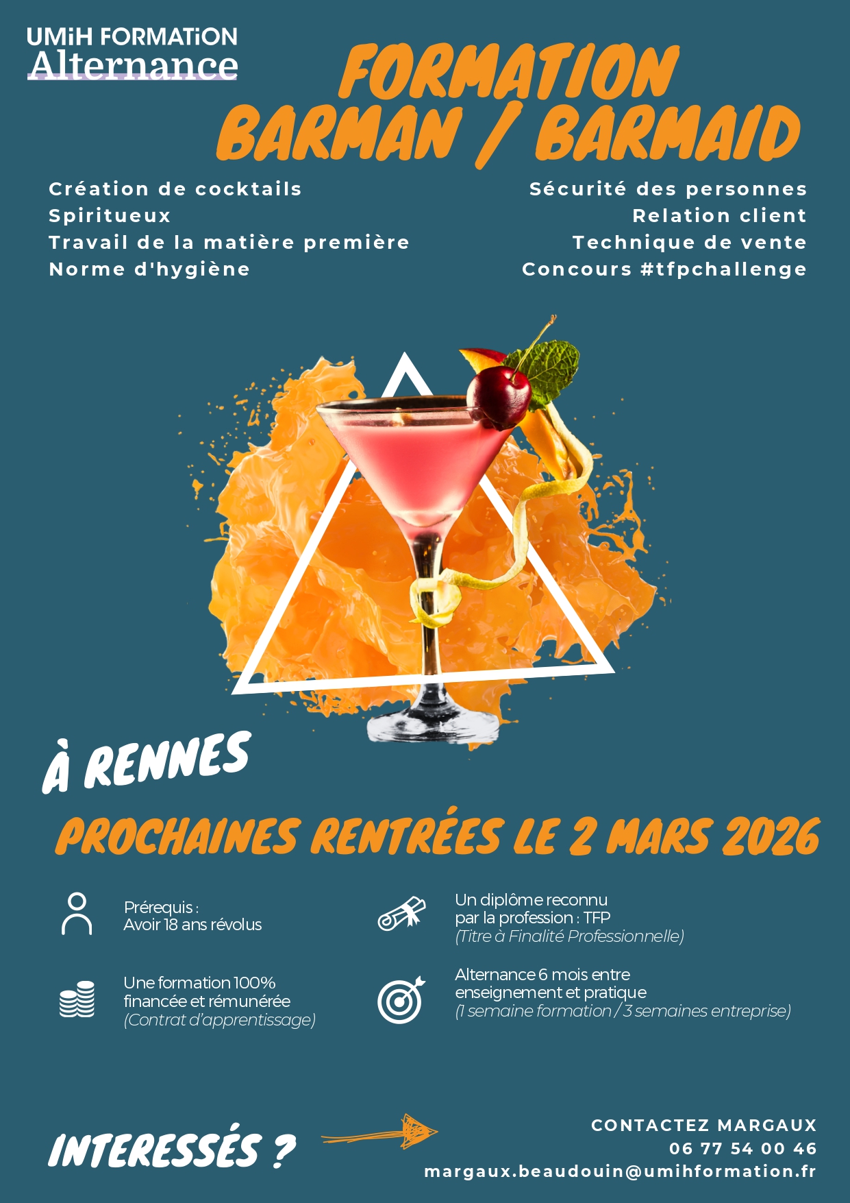 Nouvelle session TFP Barman en Mars 2026 mardi 13 janvier 2026Umih Formation ouvre une nouvelle session TFP BARMAN en alternance à Rennes à compter du 02 mars 2026 pour une durée de 6 mois (5ème session sur Rennes). Dans ce cadre, nous souhaiterions savoir si vous êtes susceptibles d'accueillir un(e) alternant(e) barman sur la période de mars à septembre 2026. Le coût de la formation peut être financée par l'OPCO selon les règles en vigueur. Intéressé ? Contactez Margaux BEAUDOUIN : 06.77.54.00.46 / margaux.beaudouin@umihformation.fr |